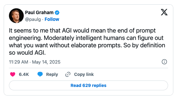 Paul Graham has pointed out that true artificial general intelligence (AGI) would eliminate the need for carefully crafted prompts altogether. AGI systems will prompt themselves, dynamically optimising their queries and interactions. Today’s detailed prompt crafting is a temporary workaround, bridging the gap until AI reaches a level of intuitive interaction and self-driven understanding.